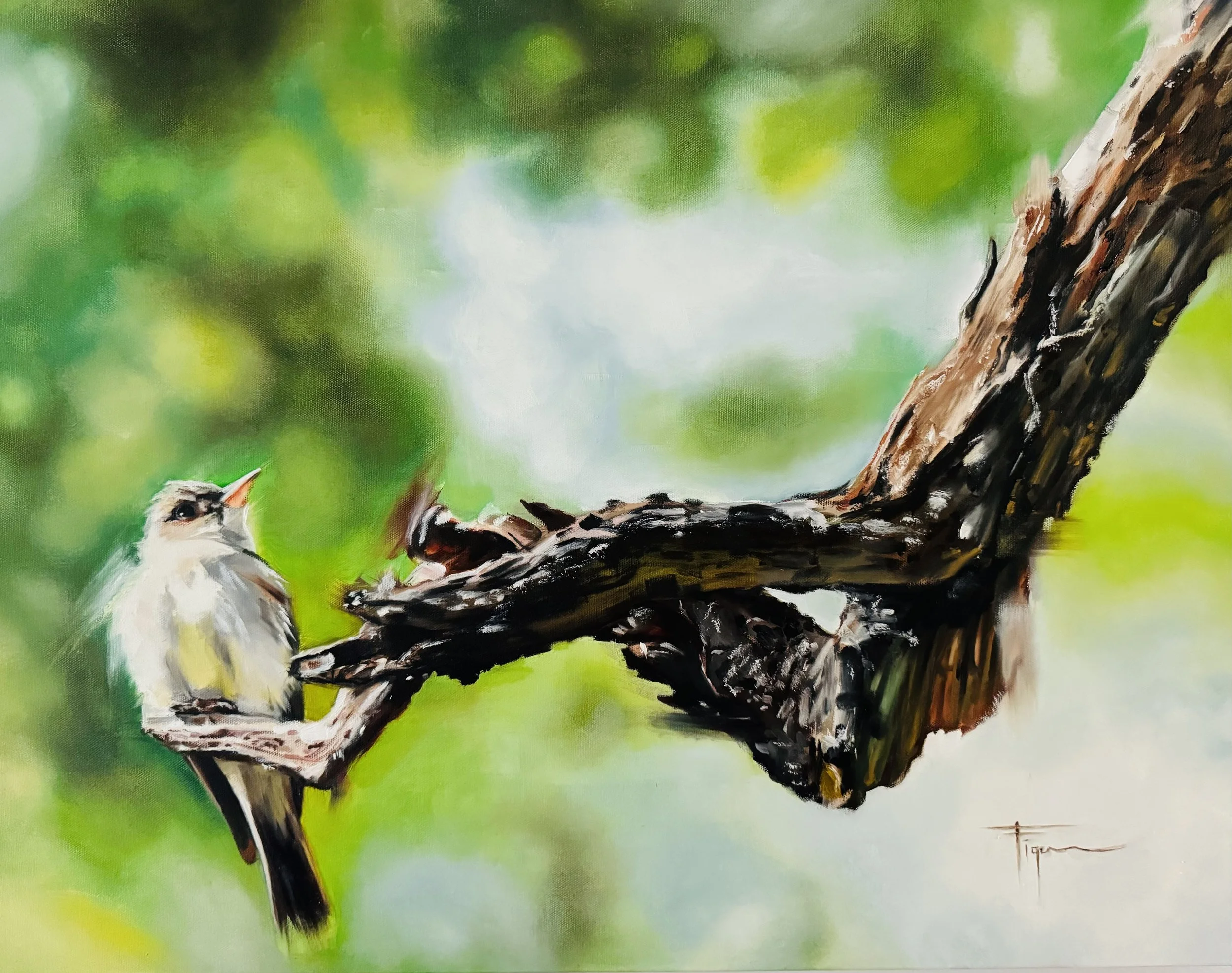 "Nature's Hand" captures a moment of surreal harmony between nature and artistry. In this enchanting scene, a bird delicately perches on a branch that bears an uncanny resemblance to a human hand, as if nature itself is extending a gesture of welcome. Photographer Randy Hoffman's keen eye for beauty in the natural world is evident, drawing viewers into a world where the boundaries between the human and natural realms blur, creating a captivating and thought-provoking image. This stunning photograph, transformed into an oil painting by Victor Figueroa, invites contemplation and wonder.
