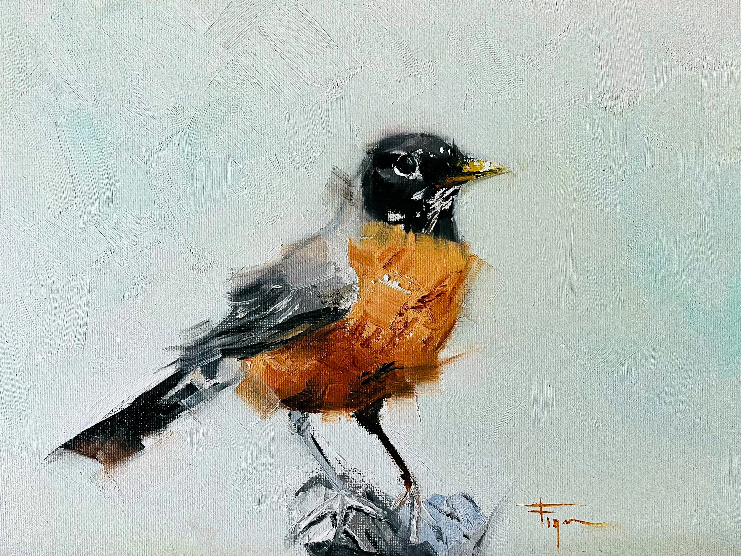 "The Forager" by Victor Figueroa is a captivating oil painting that celebrates the beauty of nature. The focal point of the piece is a robin, its body rendered in stunning shades of golden, copper, and orange, standing gracefully on a rock. The bird's pose suggests a moment of contemplation or perhaps the anticipation of a meal, embodying the spirit of foraging. Against a bright white background, the robin's colors are brought to life, creating a striking contrast that draws the viewer's eye. Figueroa's meticulous attention to detail and skillful use of color and light make "The Forager" a standout piece that captures the essence of the natural world.